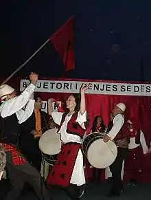 In the past, epic poetry in Kosovo and northern Albania was sung on a lahuta (a one-string fiddle) and then a more tuneful çiftelia was used which has two strings – one for the melody and one for drone. Kosovar music is influenced by Turkish music since the entire region spent 500 years as part of the Ottoman Empire but the Kosovar folklore preserved originality.[1] Archaeological researches tells about how old this tradition is and how it was developed in a parallel way with other traditional music in Balkan. Many roots were found in the 5th century BC like paintings in stones showing singers with instruments (In the famous the portrait "Pani" was shown holding an instrument similar to a flute).[2]