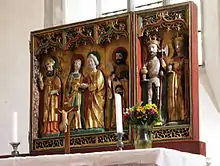 The church houses a number of medieval items. The altarpiece was manufactured on Gotland at the beginning of the 16th century. The triumphal cross is older, from the end of the 13th century, and is still in the Romanesque tradition. The choir benches, lastly, date from the 14th century. The baptismal font and the unusual pulpit are both from the second half of the 17th century, and Baroque in style.[1]