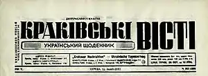 The Krakivs'ki Visti (Ukrainian: Краківські вісті: народний часопис для Генерал-Губернаторства, German: Krakauer Nachrichten Ukrainische Tageszeitung), was a Ukrainian newspaper based in Vienna, published from 1940 to 1945.[2] Historian John-Paul Himka described it as "vehemently antisemitic."[3] Himka described it as a Nazi propaganda daily, published during World War II in the Ukrainian language with the German financial aid, and with exposure orchestrated by Joseph Goebbels himself.[4]