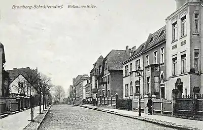 Krakowska Street, then Bollmann Straße during Prussian period, was located on the territory of a neighbouring suburb, Schröttersdorf. It almost marked during those years (1870s to 1920) the border with Bromberg area, stretching from the Brahe river to Promenaden straße (now Jagiellońska street).