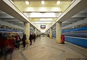 Krasny Prospekt (Russian: Кра́сный проспе́кт, "Red Avenue") is a station on the Leninskaya Line (Lenin Line) of the Novosibirsk Metro. It opened on January 7, 1986. This is a transfer station to Sibirskaya of the Dzerzhinskaya Line. The station is located under eponymous avenue (until 1920, it was known as the Nikolaevsky Prospekt (Russian: Никола́евский проспект) or Nicholas' Avenue) between its intersections with Gogol Street and Krylov Street.
