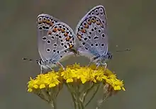 L. eurypilus Frr. (= carmon Gerh.) (78 g, h). Much smaller than the preceding forms, very similar to argus, but male not blue above but dark brown like the female, bearing often also like this sex red-yellow marginal spots in the anal area of the hindwing . — Asia Minor, Mesopotamia, Turkestan and North Persia, on rocky slopes, from May till July. Larva probably on Astragalus echinus, as the butterfly is especially plentiful where this plant grows.[3]