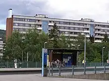 Kringsjå is a rapid transit station situated on the Sognsvann Line, 8.4 kilometers (5.2 mi) from Stortinget in the city center.[10] It is open ground station featuring two side platforms. The station meets the metro standard of the Oslo Metro. This includes two 120-meter (390 ft) side platforms and an overpass. The station is designed by Arne Henriksen and features a small steel and glued laminated timber roof on each platform. It has a similar design to most of the other stations on the line.[11]
