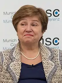 Kristalina Ivanova Georgieva-Kinova (Bulgarian: Кристалина Иванова Георгиева-Кинова; née Georgieva; born 13 August 1953)[1] is a Bulgarian economist serving as the 12th managing director of the International Monetary Fund since 2019. She was the Chief Executive of the World Bank Group from 2017 to 2019 and served as Acting President of the World Bank Group from 1 February to 8 April 2019 following the resignation of Jim Yong Kim. She previously served as Vice-President of the European Commission under Jean-Claude Juncker from 2014 to 2016.