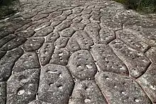 Ku-ring-gai Chase is part of the Hornsby Plateau, a massive block of sandstone tilting upwards to the north. The park comprises a plateau with an elevation of generally 150–200 m above sea level. Between 250 and 200 million years ago, sand silt and mud was deposited by rivers across flood plains.[9] These formed the shales, flagstones and sandstones of the Narrabeen Group that outcrop along the foreshores and ridges. Higher areas of the park are underlain with pink, white and orange layers of Hawkesbury Sandstone that contain small beds of shale. Wianamatta Group shale is present in the higher points of the park. The park's terraced landscape is due to the horizontal arrangement of these sediment layers.[9]