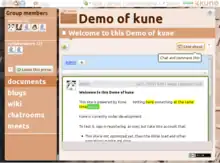 Kune was a free/open source distributed social network focused on collaboration rather than just on communication.[2] That is, it focused on online real-time collaborative editing, decentralized social networking and web publishing, while focusing on workgroups rather than just on individuals.[3][4] It aimed to allow for the creation of online spaces for collaborative work where organizations and individuals can build projects online, coordinate common agendas, set up virtual meetings, publish on the web, and join organizations with similar interests. It had a special focus on Free Culture and social movements needs.[5][6] Kune was a project of the Comunes Collective. The project seems abandoned since 2017, with no new commits, blog entries or site activity.[7]