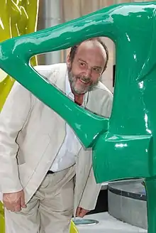 His opinionated sculptures are made of materials that are heavy, but seem to be light when seen in the definitive work (Marble, Bronze, Iron, Aluminium). Sometimes, the materials are bare, but often they are painted unicolored with a rather violent color.