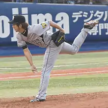 ![]() Fujikawa pitching for the Hanshin Tigers, at Hanshin Koshien Stadium | ||||||||||||||||||||||||