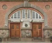 Læssøgade School is a three-story building constructed of red brick on a base of granite in the National romantic style with elements of Baroque revival.[2] The corners of the building are accentuated as avant-corps with shadow joints and lesenes. The school was constructed as a 4-winged structure around an atrium similar to the Samsøgade School, completed a few years earlier. However, in Læssøgade School the atrium roof is at the same level as the roofs of the rest of the buildings and not at the 1st floor like in Samsøgade School. This difference creates an imposing spacious atrium which at the time was an unusual feature. In 1969 the school was expanded with toilet buildings in the school yard and an additional, smaller building to the north.[3]