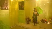 Assistants will help the medium don different costumes to match the particular gods they are incarnating; for example, if a practitioner is acting as a medium for a god who takes the form of a general, he or she may wear a general's robes, and perform a dance incorporating swords or other weapons. A medium may incarnate several gods during one session, changing his or her costume and adapting his or her movements to each. Musicians—singers and instrumentalists—accompany the practitioner, and shift from one musical style to the next depending on which god is being incarnated.[2][4] When the dance is finished, the audience is allowed to approach the still-possessed medium to make offerings, petition the deity being incarnated in exchange for favours, or to have their fortune told. The medium offers sacred gifts in return, often in the form of joss sticks.[5]