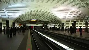 The Metro station, which opened on July 1, 1977, is one of four major interchange stations on the Metro system. It is the only station to serve five of the six Metro lines: the Green and Yellow lines with two side platforms on the upper level, and the Blue, Orange, and Silver lines with one island platform on the lower level. It was the seventh-busiest Metro stop in 2023, with an average of 7,506 daily passenger entries.[2]
