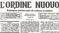 L'Ordine Nuovo (Italian for "The New Order") was a weekly newspaper established on 1 May 1919, in Turin, Italy, by a group, including Antonio Gramsci,[1] Angelo Tasca and Palmiro Togliatti, within the Italian Socialist Party.[2][3] The paper was the successor of La Città futura, a broadsheet newspaper.[4] The founders of L'Ordine Nuovo were admirers of the Russian Revolution and strongly supported the immediate creation of soviets in Italy. They believed that existing factory councils of workers could be strengthened so that they could become the basis of a communist revolution.[5] However, Amadeo Bordiga, who would become the founder of the Communist Party of Italy, criticised the plan as syndicalism, saying that soviets should only be created after Italy had come under communist control.[6]