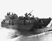 As early as 1930, the United States Marine Corps was interested in landing tankettes on beaches along with assaulting infantry. By the mid-1930s, Marine planners had settled on a beach assault procedure that involved a purpose built craft for the initial assault wave, ships' boats and cutters for follow-on troops, and a purpose built tank lighter for vehicles, guns, and supplies.[1] Nevertheless, progress was difficult and slow due to lack of funding. Also, the Navy placed restrictions on such craft – considering transportation and deployment of them from available ships.[nb 1] By 1940, prototypes, of 38-foot to 40-foot long vessels,[2] had been built and tested. The positive attributes of these were recognized and, by September 1940, the USMC had made known their requirements for a tank landing craft. The Navy's Bureau of Construction and Repair produced a 45-foot lighter capable of carrying the 15 ton Army model tank the Marines anticipated using.[3] What evolved became the LCM (2),[4] although at the time it was referred to using the Marine Corps designation of YL.[5][nb 2]
