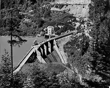 Hydroelectric power was first produced from LaGrande in November 1912 as the first independent project of Tacoma Power.[2] The present structure was completed in 1945, the same year as Alder Dam's construction. It produces about 65 megawatts, is about 192 feet high, but only holds about 2,700 acre-feet (3,300,000 m3) of water.