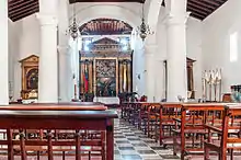 Set in the tree lined Plaza Bolivar, the church has a rectangular plan with massive walls as protection against pirate attacks. The main body of the cathedral, which is rectangular in shape, has dimensions of 17 by 48 metres (56 by 157 ft), and the interior is lined with two rows of huge columns in the tuscan style which support the roof. There is a bell tower outside, which is unique and the bells are now preserved in the plaza. One of the most important religious buildings on the Island, the Virgin of La Asunción is worshiped here. The cathedral has been declared a historical city monument. It has a plain façade and interior, but its left lateral tower, which dates to 1599, is the oldest in the country. The façade at the entrance portal of the church is built in the renaissance style. It was considered a model church till the 19th century.