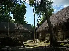 Investigations of the West Group have revealed an occupation beginning in the Late Classic and reaching its maximum extent in the Terminal Classic.[11] The construction methods used in the West Group were inferior to those of the acropolis, consisting of finely cut limestone blocks bound with an earth-based mortar rather than the lime-based mortar used in the palace complex.[31] The platforms of the West Group appear to have supported perishable superstructures and some of these buildings may have been dedicated to craft production.[32]