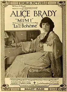 La Bohème (aka: La vie de Bohème) is a 1916 American silent historical film directed by Albert Capellani and distributed by World Pictures. The star of this version is Alice Brady, whose father William A. Brady was the founder of World Pictures. This film is one of many silent versions, actually the third or fourth. Later silent versions appeared in 1917 and 1926 starring Lillian Gish. Director Albert Capellani's brother, Paul Capellani, who appears in this film, had made his own short version in 1912.[1][2]