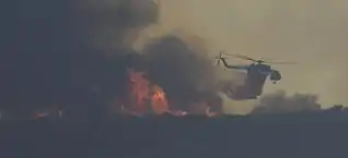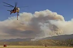 ![]() An Ericcson Skycrane prepares to drop flame retardant on the La Brea Fire | |