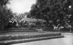 La Chiquita is located on Channel Drive near the Santa Barbara Biltmore property. It is set amongst oaks on a long, fairly narrow rectangle from the shore drive along the Pacific, back toward the protecting mountain wall. Another driveway, paralleling the shore, cuts a square off the rear end of the long rectangle. The detached rear square naturally offered possibilities as a secluded garden but open upon a central axis which led to the entrance of the house, set well back upon the larger portion of the land.[2]
