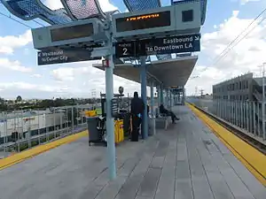 La Cienega/Jefferson station is an elevated light rail station on the E Line of the Los Angeles Metro Rail system. The station is over the intersection of La Cienega Boulevard and Jefferson Boulevard, after which the station is named, in the Baldwin Hills/Crenshaw and West Adams neighborhoods of Los Angeles.[3] The station briefly served as the western terminus of the E Line between the opening of the line on April 28, 2012, and the completion of the Culver City station on June 20, 2012.[4]