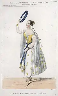 La Esmeralda premiered on 14 November 1836 at the Théâtre de l'Académie Royale de Musique in Paris.[8] There was some disruption at the premiere, as members of the audience who disliked the Bertin family shouted out that the work had been written by Berlioz. Berlioz himself denied this accusation, and labelled Bertin a "writer and a musician of considerable distinction and one of the most intelligent women of our time". There were also accusations that it had only been performed because of her brother's connection to the administration of the Paris Opera and the family's directorship of the influential newspaper, Journal des débats (to which both Victor Hugo and Berlioz were contributors) led to open disdain by those who opposed the newspaper's political stance. There were hisses and groans, and after the one aria, Quasimodo's "Air des Cloches" ("Song of the Bells") in act 4, several members of the audience, including Alexandre Dumas, shouted "It's by Berlioz!".[9] The opera was withdrawn after six performances. For the last of these, 16 December 1836, it had been shortened to three acts and was followed by the ballet La Fille du Danube starring Marie Taglioni.[10] It was at the final performance, that a near-riot ensued. The anti-Bertin faction began shouting "Down with Bertin!" "Down with the Journal des débats!" "Bring down the curtain!" They kept it up until Cornélie Falcon fled the stage and the curtain was lowered. It was not raised again until the ballet began.[11] Louise Bertin would never compose another opera, although she lived for another 40 years. In her memoirs, Adèle Hugo wrote of the opera's final word, "Fatalité!":