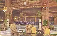 The hotel's Main Lobby was dramatic and opulent with green and gold decorations, carrying the theme through its carpets and drapes. It was furbished with marble throughout: floors, statues and a desk. Accents included brass fixtures and spittoons. There were over-sized, upholstered chairs, as well as shorter ones for women and children.[20]
