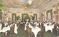 Two large chandeliers hung from the gilded and vaulted ceiling of the green and gold themed Louis XVI Dining Room. Brass sconces were built in between the windows. A gilded and vaulted ceiling, and a repeating green and gold theme drew on the style of the Main Lobby.[20]