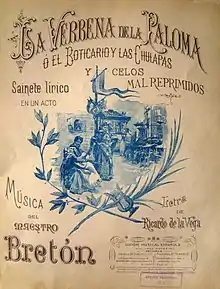 La verbena de la Paloma (The Fair of the Virgin of la Paloma) —subtitled El boticario y las chulapas y celos mal reprimidos— is an 1894 zarzuela with a libretto by Ricardo de la Vega and music by Tomás Bretón. It premiered on 17 February 1894 in Teatro Apolo, Madrid. It was later adapted for the cinema in 1921 by José Buchs, in 1935 as Paloma Fair by Benito Perojo[1] and in 1963 as The Fair of the Dove by José Luis Sáenz de Heredia.