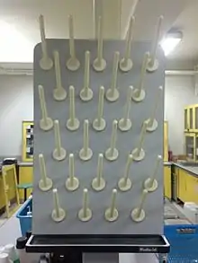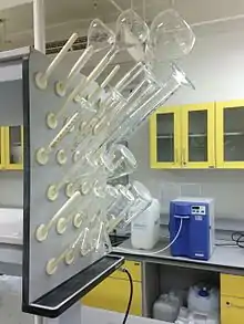 Laboratory drying rack is a pegboard for hanging and draining glassware in a laboratory. It is available in different varieties and sizes. It can be used for different materials of glassware in the laboratory room such as funnels, pipettes, mixing balls, slides, bottle stoppers, tubing and so on.[1] In addition to that, the pegs on the drying rack are easily removable and replaceable in order to maintain the cleaning of the lab racks to avoid contamination with other apparatus used on the same rack.[2] Any common laboratory needs to have at least two or three drying racks per lab.[3]