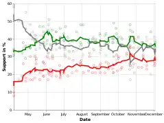 Since the end of 2021, Labour consistently polled ahead of the Conservatives as the governments under prime ministers Boris Johnson, Liz Truss, and Rishi Sunak were affected by issues such as the cost of living crisis, the July 2022 government crisis, the September 2022 mini-budget, the October 2022 government crisis, and the industrial disputes.[161][162] By mid-October 2022, Labour were recording polling leads such as 36% against the Conservatives according to Redfield & Wilton.[163]