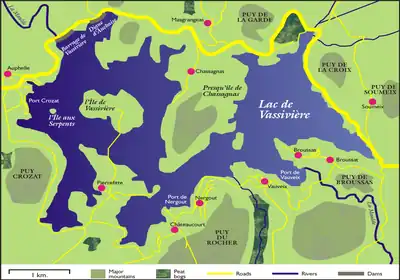 The lac de Vassivière or Vassivière Lake (French pronunciation: [vasivjɛʁ]; Occitan: Vacivièra), one of France's largest artificial lakes, is a large man-made reservoir of about 10 square kilometres (2,500 acres). It is situated on the Plateau de Millevaches in the départements of Creuse and Haute-Vienne. It is the largest area of water in the Limousin region of France and provides water supplies, hydroelectricity, and leisure facilities.