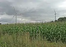 In 2005 a wind farm consisting of three REpower MM82 wind turbines was erected on the outskirts of Ladbergen.[9] Each of these MM82 wind turbines has a 80.0 m (262.5 ft) hub height and 82.0 m (269.0 ft) rotor diameter giving a total sweep of 5,281 m2 (56,844 sq ft) and an average power capacity of 2.050 kW. The power output is controlled by varying the pitch of the rotor blades which can operate at 8.5–17.1 rpm rotor speed.[10] Together with the two anaerobic digestion plants that went into operation in 2006, the community - mathematically - can fulfill its energy needs. Another quite large power plant producing annually 50 million kWh electricity and 60 million kWh/216 million MJ of heat and process steam from renewable raw materials built by ME Münsterland Energy GmbH went into production in 2007. This wood pallets-fired combined heat and power gasification plant and accompanying district heating station at the Ladbergen canal harbor on the site of the old oil mill produces electric power for about 15,000 households, a multiple of the Ladbergen household's electric energy needs. The thermal power generated in the cogeneration process is used to supply industrial customers near the power plant location itself and also for residents in the nearby Airport Park of Münster-Osnabrück Airport.[11]
