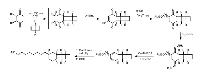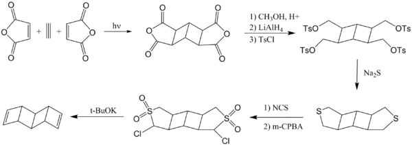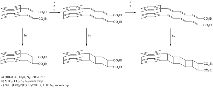 Various synthetic methods have been used for the laboratory synthesis of ladderane compounds. The three major approaches are (1) dimerization of polyene precursors, (2) the stepwise addition, one or two rings at a time, (3) and oligomerization.[3] Several examples of ladderane synthesis are outlined below.
