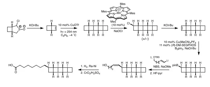 In 2016, Burns and co-workers at Stanford University reported an enantioselective synthesis of both the [3]- and [5]-ladderane lipid tails and their incorporation into a full phosphatidylcholine lipid.[13] Both routes leverage a small [2]-ladderene building block bicyclo[2.2.0]hexene prepared by a Ramberg–Bäcklund reaction. The route to a [5]-ladderane-containing fatty acid involves dimerization of this intermediate to form an all-anti [5]-ladderane hydrocarbon. C–H chlorination by a manganese porphyrin catalyst and subsequent elimination introduces unsaturation to produce a [5]-ladderene. Hydroboration and a Zweifel reaction install the linear alkyl group.