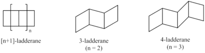 Synthetic approaches have yielded ladderanes of varying lengths. A classification system has been developed to describe ladderanes based on the number of consecutive rings.[3] The length of the ladderane is described by the number in brackets that precedes the word "ladderane". This is equal to the number of bonds shared by two cyclobutanes (n) plus 1.
