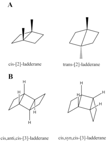Ladderanes have two types of stereochemical relationships.[3] One describes the relative arrangement of hydrogen atoms at the fusion between two cyclobutane rings. These hydrogen atoms can be in either the cis- or trans- configuration. Trans-ladderanes have not been synthesized due to the ring strain in these compounds.