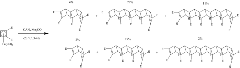 Ladderanes with lengths up to 13 cyclobutane rings have been synthesized by Mehta and coworkers.[6] This process involves the in situ generation of dicarbomethoxycyclobutadiene from its Fe(CO)3 complex at low temperatures with the addition of ceric(IV) ammonium nitrate (CAN). Generation of the butadiene rapidly forms a mixture of [n]-ladderanes of lengths up to n = 13 with an overall yield of 55%. All of the ladderanes synthesized through this method have one cis,syn,cis structure. This may be a result of the initial dimerization of two cyclobutadienes which preferably forms the syn product, shown below. The further dimerization only produces the anti product due to steric factors.