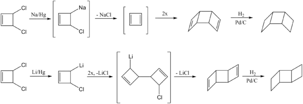To generate the anti product, cis-3,4-dichlorocyclobutene is treated with lithium amalgam.[5] The lithium derivative undergoes a C-C coupling reaction to produce the open dimeric structure. This intermediate reacts to form the anti-diene, which can be hydrogenated to form the final anti-[3]-ladderane product.
