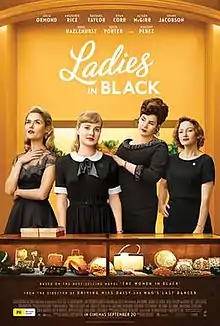 Ladies in Black is a 2018 Australian comedy-drama film directed by Bruce Beresford.[5] Starring Angourie Rice, Rachael Taylor, Julia Ormond, Ryan Corr and Shane Jacobson, the film is based on the 1993 novel The Women in Black by Madeleine St John, and tells the story of a group of department store employees in 1959 Sydney. The film was released on 20 September 2018.[6]