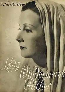 Lady Windermere's Fan (German: Lady Windermeres Fächer) is a 1935 German comedy film directed by Heinz Hilpert and starring Lil Dagover, Walter Rilla and Aribert Wäscher.[1] It is based on the play Lady Windermere's Fan by Oscar Wilde. The film's sets were designed by the art directors Heinrich Beisenherz and Ludwig Reiber.