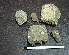 The kimberlite was discovered in 1971 when a logging road was bulldozed through the area exposing the unusual looking rock. The exposure consists of several small areas otherwise overlain by glacial till. Magnetic survey work done in 1956 [2] depicts an elliptical positive anomaly 590 feet (180 m) long in an east–west direction and 390 feet (120 m) wide, which probably defines the limits of the pipe. The kimberlite is intruded into volcanic rocks of the Proterozoic Hemlock Formation. The exposed material is grayish green to reddish, iron stained highly weathered and consists of disaggregated rubbly fragments up to 10 inches (250 mm). It is generally accepted that the pipe was emplaced about 180 million years ago.