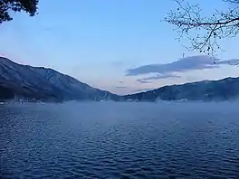 Lake Kizaki (木崎湖, Kizaki-ko) is a lake, situated near Ōmachi, Nagano, Japan, and located at the foot of the northern Japanese Alps mountain range. Mesotrophic and subalpine in nature, numerous lakeside attractions surround the lake, with the locale being a popular lakeside resort. Kizaki is also one of the "Nishina Three Lakes", which include Lake Aoki and Lake Nakatsuna.
