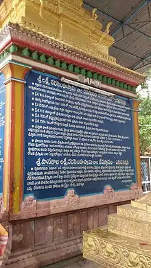 The Lakshmi Narasimha Temple is popularly believed to have been founded by Yudhishthira, the eldest Pandava brother.[4] The temple's history is said to be recorded in the Brahma Vaivarta Purana, one of the old Hindu religious scriptures.[4] This temple was patronized by the Vijayanagara rulers. There is an inscription from the time of Krishnadevaraya, who had visited the temple, at the temple site.[4] The temple's tall eleven story gali gopuram was built by Vasireddy Venkatadri Nayudu, a zamindari patron and devotee of Narasimha.[4]