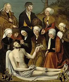 Lamentation of Christ was a popular Renaissance subject matter which allowed artists to capture the highly pious and emotional moment when the body of Jesus had been taken off the cross. The 1538 composition is one of several lamentation paintings completed by Cranach the Elder and his studio during the early decades of the 16th century.[6] Completed in the aftermath of the Reformation, the work is said to emphasize the importance of personal spiritual experience. According to Polish art historian and museum administrator Piotr Oszczanowski, the artist blurs the hierarchy of importance among depicted figures and captures the individuality of their respective religious and emotional responses.[7][8]