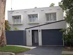 Rectangular in plan the house spans across the block with minimal setbacks from side boundaries. The walls are constructed of brickwork which has been rendered and painted, floors are built of timber and skillion roofs are sheeted in corrugated asbestos cement. Openings, primarily timber casement windows, are concentrated in the longer northern and southern elevations facilitating illumination and ventilation of the interior while maintaining privacy. The compact plan of the house ensures the maximum amount of garden space on the small site.[1]