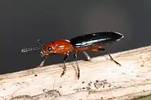 Languria mozardi, the clover stem borer, is a species of lizard beetle in the family Erotylidae. Red and black, its length ranges from 4mm to 9mm. Adults may be found on a variety of plants, but its larvae develop in the stems of Trifolium pratense.[1] It is found in Central America and North America.[2][3][4]
