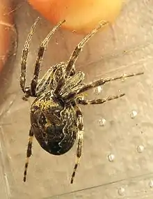 Larinioides sclopetarius, commonly called bridge-spider [1]or gray cross-spider, is a relatively large orb-weaver spider with Holarctic distribution. These spiders originated in Europe, have been observed as south as the Mediterranean Coast and as north as Finland, and have been introduced to North America. They are often found on bridges, especially near light and over water.[2] The species tends to live on steel objects and is seldom seen on vegetation.[3][4] Females reach a body length of 10–14mm, and males 8–9mm.[2] Their orb webs can have diameters of up to 70 cm.