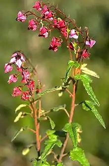 Lasiopetalum glutinosum is a spreading, multi-stemmed, sticky shrub that typically grows to 0.2–1 m (7.9 in – 3 ft 3.4 in) high and 0.2–1.5 mm (0.0079–0.0591 in) wide, its young stems covered with white and rust-coloured, star-shaped hairs. The leaves are egg-shaped, often with three lobes, mostly 10–53 mm (0.39–2.09 in) long and 3–44 mm (0.12–1.73 in) wide on a petiole 4.0–6.5 mm (0.16–0.26 in) long. Both surfaces of the leaves are covered with white and rust-coloured, star-shaped hairs. The flowers are borne in loose groups of two to twelve 38–111 mm (1.5–4.4 in) long, on a peduncle 22–49 mm (0.87–1.93 in) long, each flower on a pedicel 4.5–9 mm (0.18–0.35 in) long with narrowly egg-shaped to elliptic bracts 2.5–5.8 mm (0.098–0.228 in) long at the base and similar bracteoles 3.3–9 mm (0.13–0.35 in) long near the base of the sepals. The sepals are bright pink or dark red, the lobes egg-shaped and 4.3–8.5 mm (0.17–0.33 in) long and there are no petals. The anthers are dark red with a white tip and 3.5–5.8 mm (0.14–0.23 in) long. Flowering occurs from September to December.[2][3]
