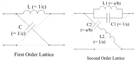 The two simplest all-pass networks are the first and second order lattices. These are important circuits because, as Bode pointed out,[20] all high order all-pass lattice networks can be replaced by a cascade of second order networks with, possibly, one first order network, to give the identical response.