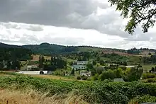 The main road through the community is Laurelwood Road, which windingly descends through dense tree cover from the top of the Chehalem Mountains and past the academy on its way towards Gaston.[22][23] The name comes from the abundance of laurel trees above the valley that stretch to the top of Bald Peak atop the mountain to the east.[3] By 1981, one of the trees was still standing, but the compiler of Oregon Geographic Names was informed that the trees were in fact Pacific Madrones.[24] The Washington County Scenic Loop passes through the hamlet.[22] The area also lends its name to a type of soil composed of silt loam.[25][26]